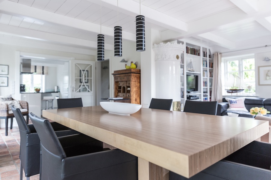 Der Wohn- und Essbereich des Ferienhauses ist von der Küche durch eine transparente Schiebetür abtrennbar: So können Sie ihn vor störenden Gerüchen abschließen, ganz wie Sie wollen. Sie sind im Ferienhaus „Auster Hüs“ die Hausherren und entscheiden nach Ihrem Belieben.