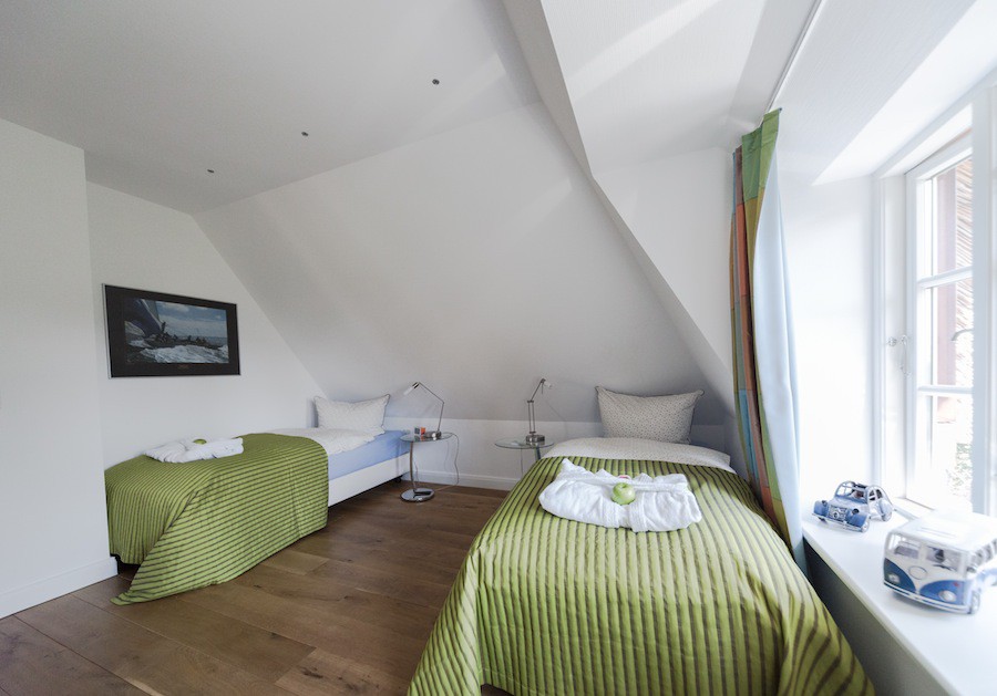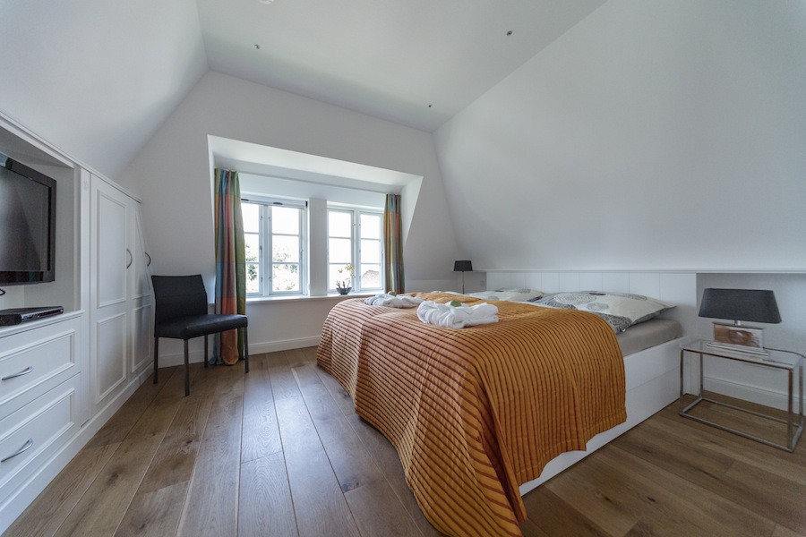 Genießen Sie in unserem Ferienhaus auf Föhr Ihren ganz persönlichen Nordsommertraum – oder Ihr Wintermärchen. Nirgends schläft man so geborgen wie unterm Reetdach. Ein letzter Blick durch die gemütlichen Sprossenfenster auf den Friesenwall und die benachbarten Häuschen. Jedes Schlafzimmer im Obergeschoss ist mit einem luxuriösen Doppelbett und einem Kleiderschrank ausgestattet. Im zweiten Schlafzimmer können die Betten sowohl einzeln oder auch zusammen gestellt werden.